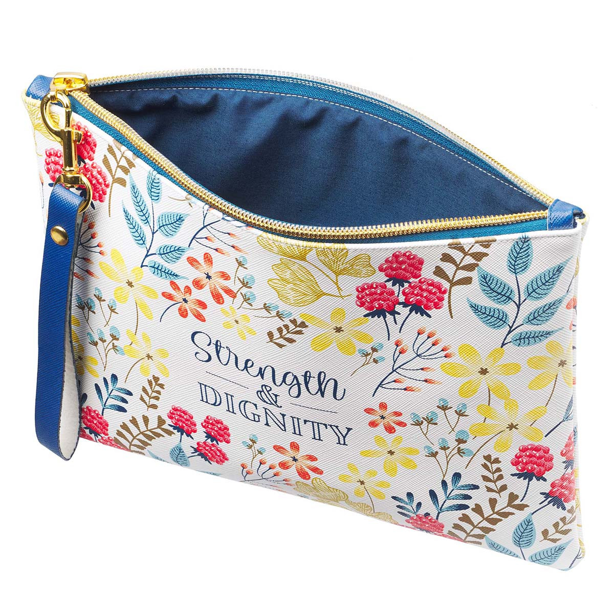 Ramitas de flores de colores sobre un fondo neutro adornan ambos lados de esta bolsa con cremallera. Un ribete azul aciano y un tirador de cremallera estilo muñequera agregan detalles al diseño. El título Fuerza & Dignidad está impreso en el mismo azul. La bolsa de piel sintética está completamente forrada con tela a juego para brindarle a sus artículos una mayor protección.