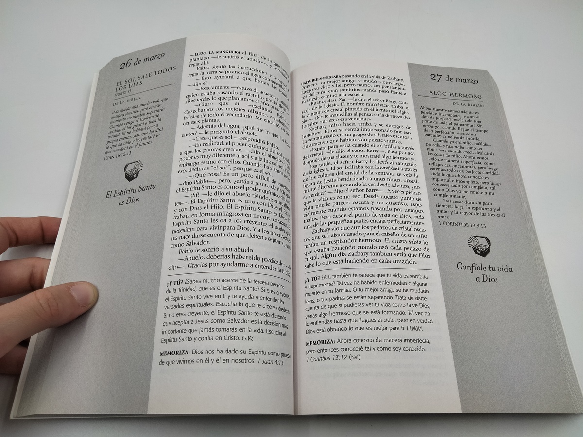 Debido a que los pasajes bíblicos de fácil lectura de la Nueva Traducción Viviente están impresos junto con las historias, este libro es todo lo que usted necesitará. También hemos incluido una “clave” al final de cada devocional que resume en tres a cinco palabras cómo pueden los hijos aplicar la lección. Es más, debido a que todas las historias han sido preparadas por Ministerios CBH (Children’s Bible Hour), ¡usted sabe que sus hijos escucharán una y otra vez!