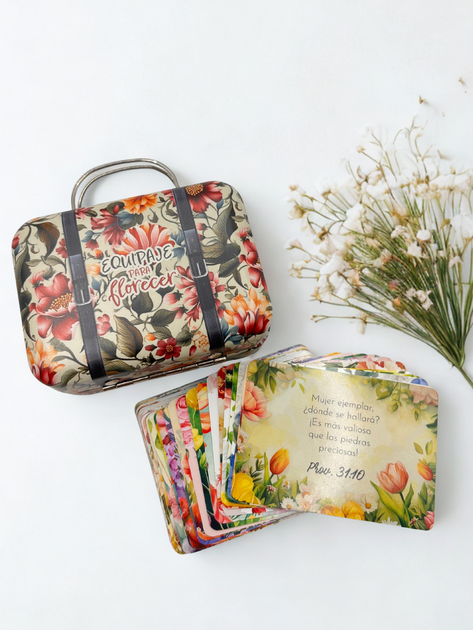 Y lo mejor de todo… ¡el set viene en una tierna maletita de empaque, perfecta para transportar tus versículos favoritos con estilo!