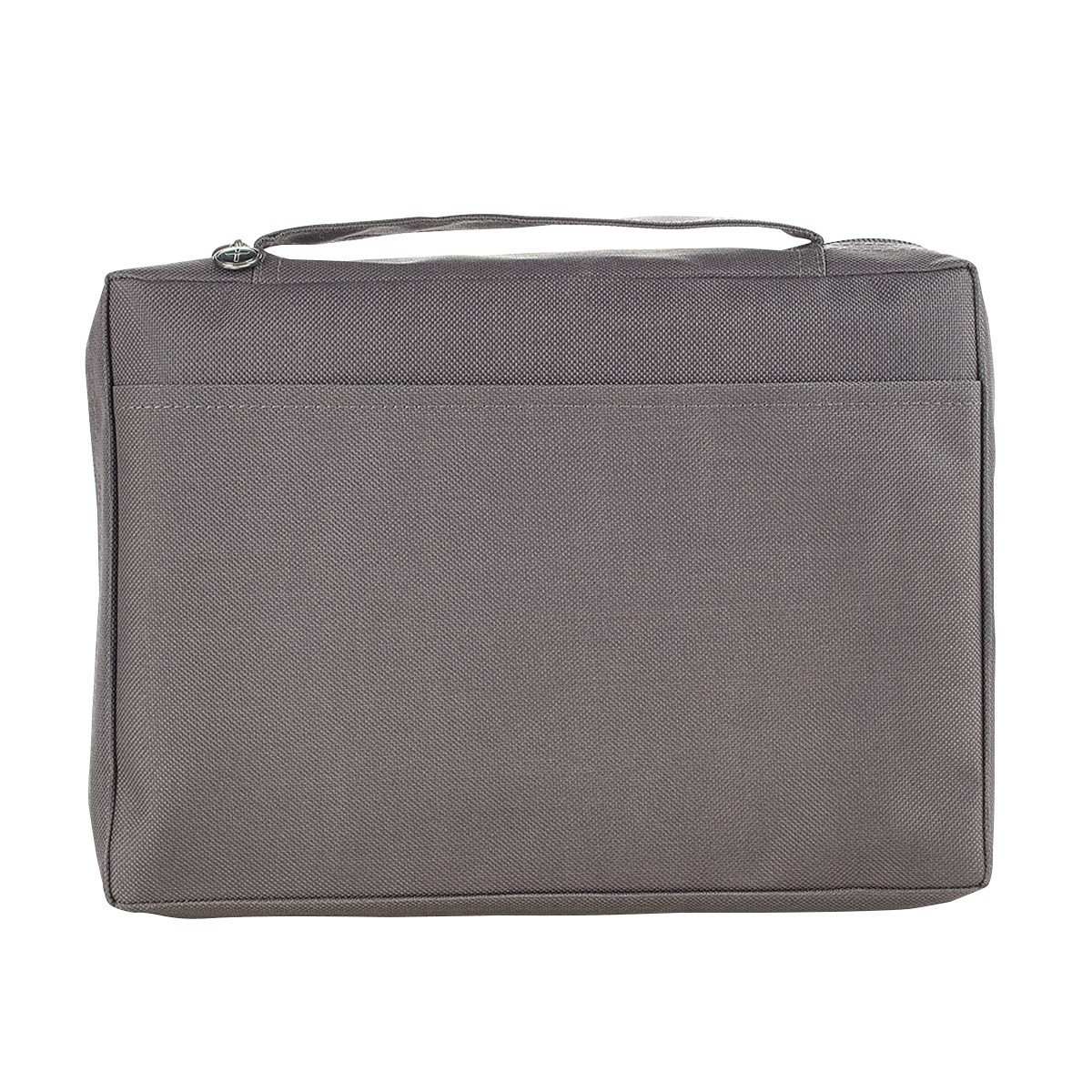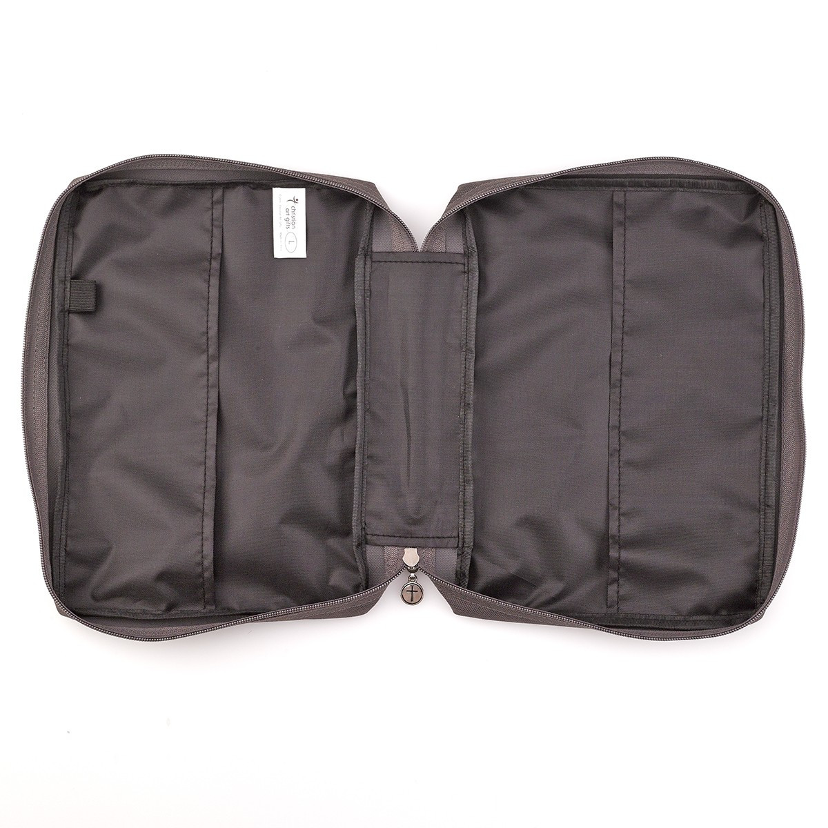 El panel trasero tiene un bolsillo deslizante. El asa del lomo cosida y plana asegura que la cubierta de la Biblia se abra completamente y quede plana. En el interior hay un lazo para bolígrafo y un tirador de cremallera grabado en forma de cruz cierra la cubierta de forma segura.