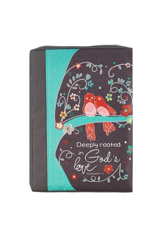 La cubierta de la Biblia Value de polilona profundamente arraigada en el amor de Dios es parte de la colección Love Grows que presenta el arte vibrante de los pájaros caprichosos de Sally Sharp apareados de por vida. Otros artículos de esta colección incluyen un juego de imanes, un bolso de mano, un cuaderno y un juego de marcadores magnéticos.