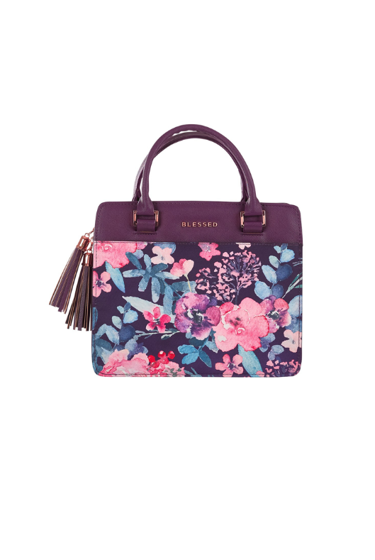 Elaborado con lujosa piel sintética, este estuche es moderno y llamativo. La base de piel sintética de color morado está cubierta con dos bolsillos exteriores serigrafiados y decorados con grandes y vibrantes estampados florales. En el panel frontal, ubicado entre las manijas, hay tachuelas de letras de metal de color oro rosa que explican el sentimiento.