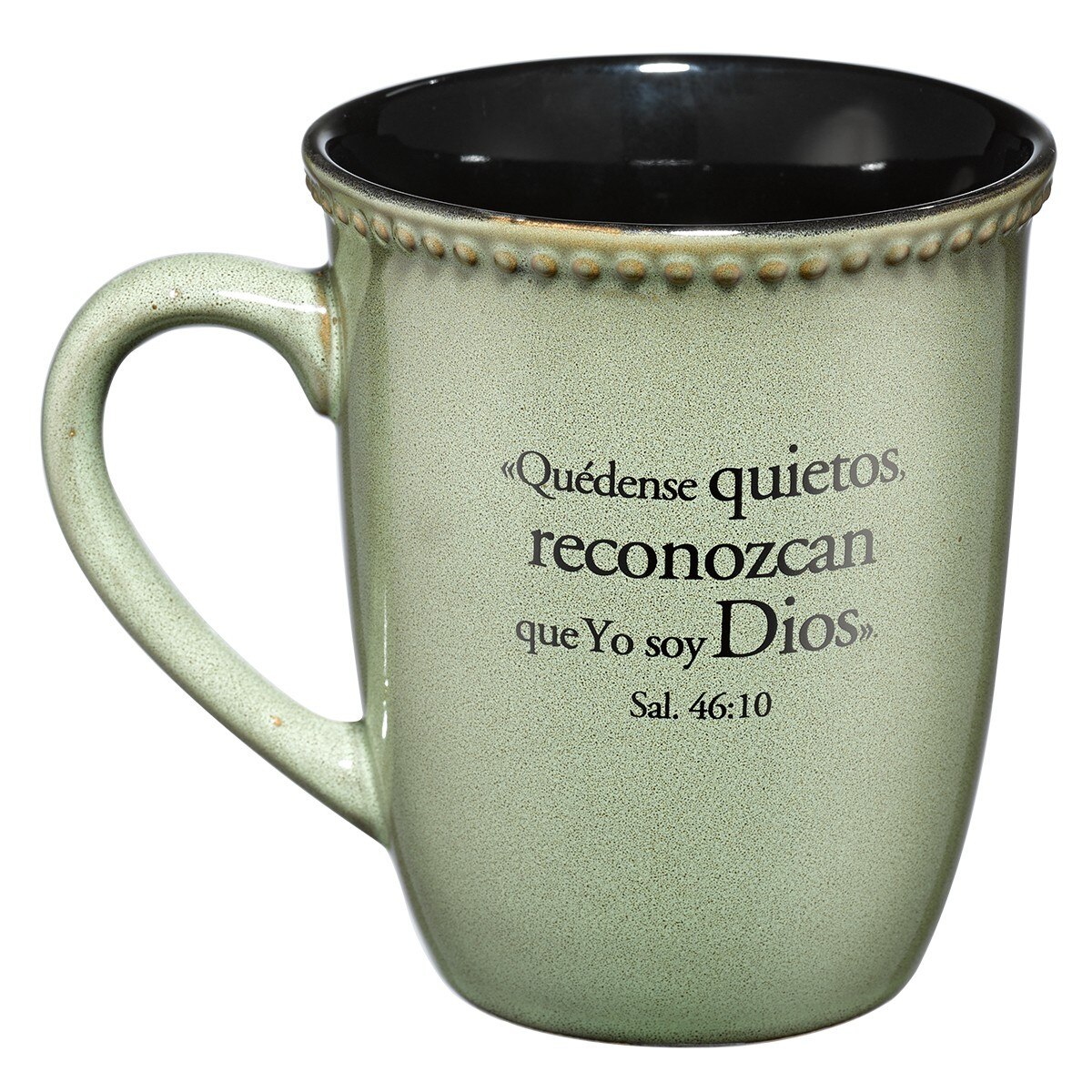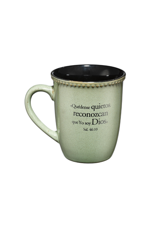 Esta taza viene empacada en una caja individual de regalo con espacio para dedicatoria. Su color verde hace de esta taza el regalo perfecto para dar y dedicar tanto a hombres como a mujeres. Por un lado, tiene la frase «Quédense quietos» y por el otro lado Salmos 46:10 «Quédense quietos, reconozcan que Yo soy Dios». Esmalte libre de plomo y cadmio. Apta para usar en microondas y lavavajillas.